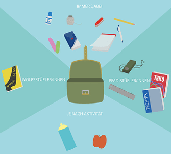 Auf diesem Bild siehst du gut, was du jede Woche zusätzlich zur Pfadiuniform in die Pfadi mitbringen sollst. Wir essen gemeinsam Zvieri, den du gerne mit den Pfadigspändli teilen darfst.